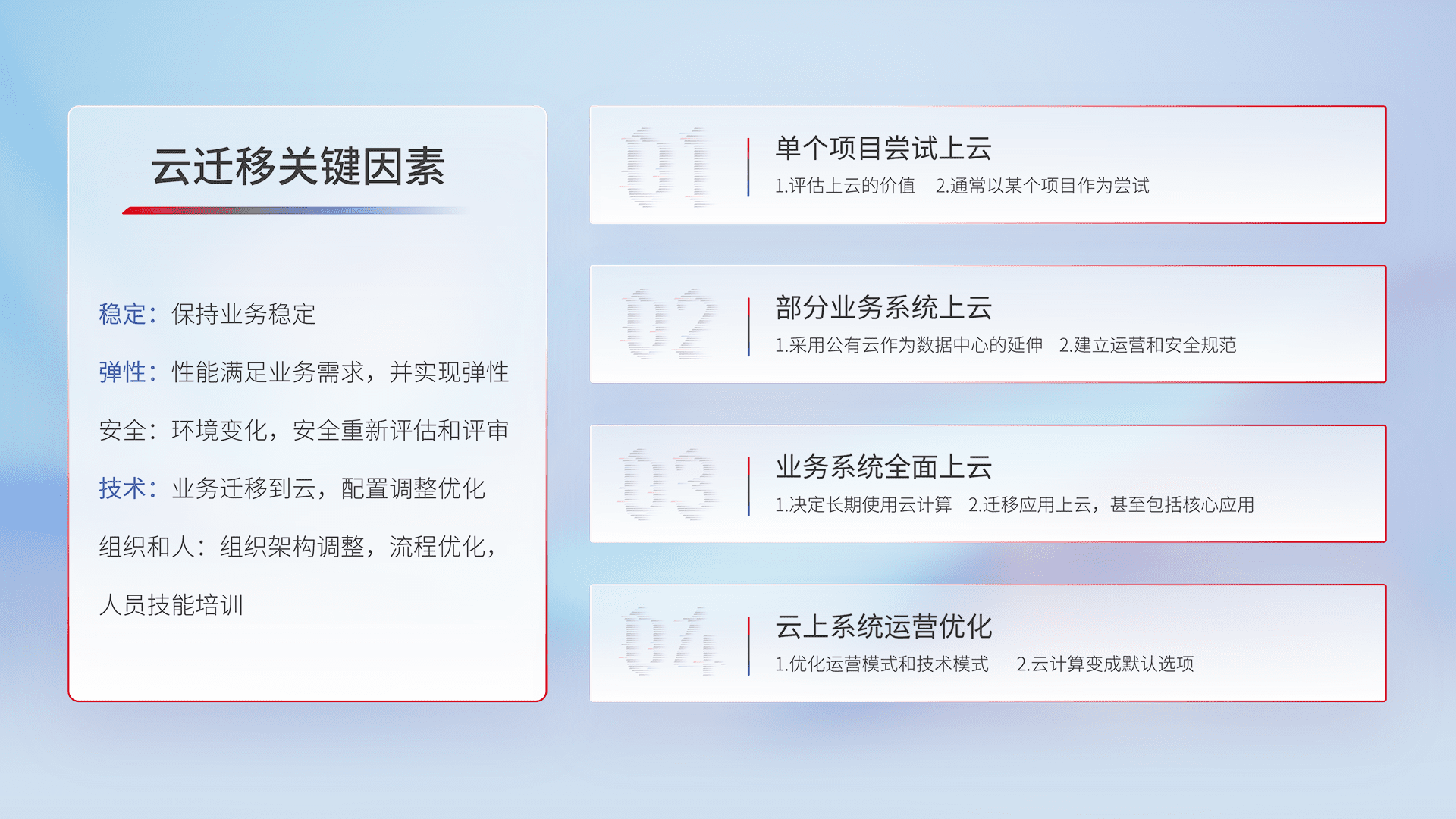 结合实际业务,,,,从规划设计、、、云平台选型、、云原生改造、、、数据迁移、、、、集成交付,,迁移全过程为客户识别最佳上云路径,,,做好风险识别管理,,,,设计网络架构、、身份权限、、、、安全审计合规、、、、操作审计、、、日志审计、、、、监控告警策略、、多站点容灾设计等,,,对云上基础设施进行整体规划,,,,提升IT治理水平,,,,以满足弹性、、、高可用、、高性能的需求。。。。