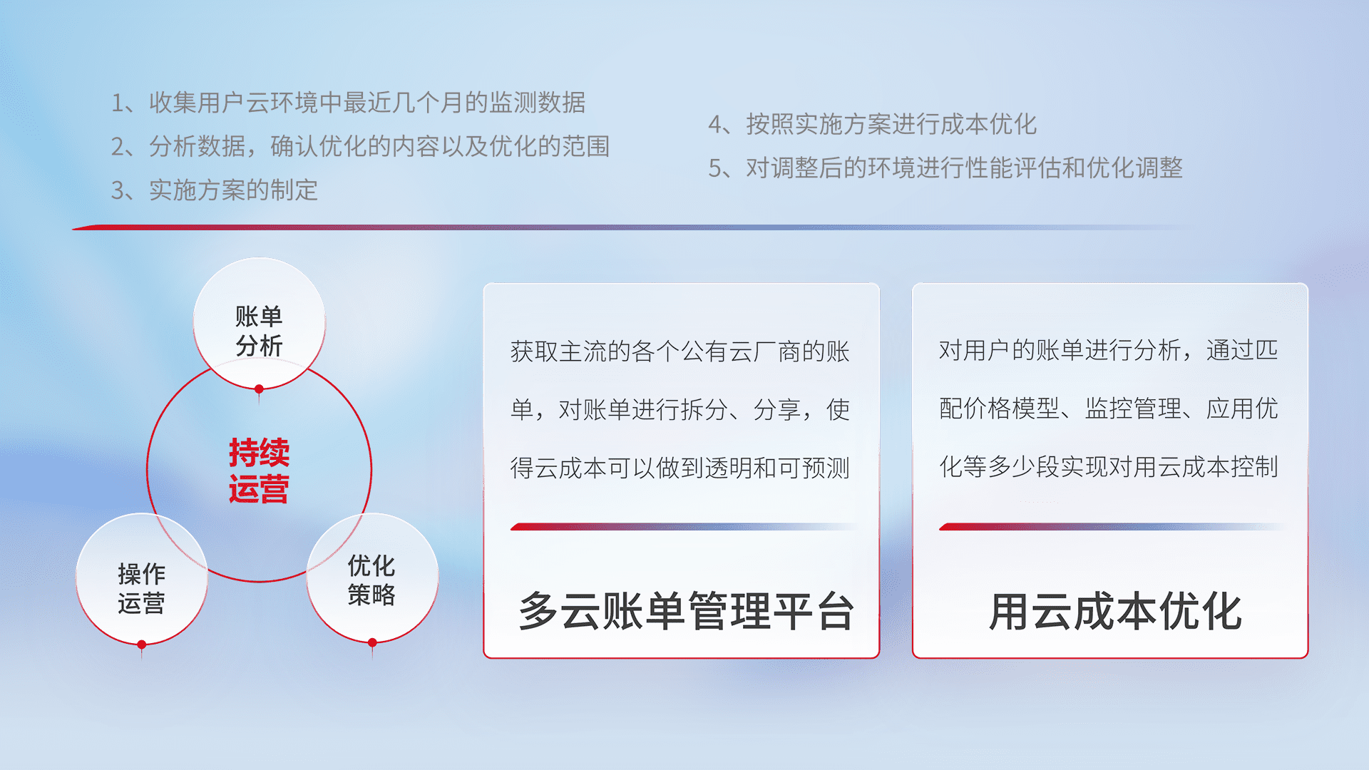 通过多云纳管,,,以统一的资源数据模型把客户的云资源进行抽象和封装,,,,进而实现对多云资源的统一操作,,,保障云资源管理的可靠性、、、、稳定性与可用性。。。量身定制化运维内容,,,,配置、、开发运维、、补丁管理、、、、备份、、、、监控、、、、认证和访问管理、、审计和日常巡检等,,保障在用云过程中的可靠度,,,,稳定度以及高可用率。。。。